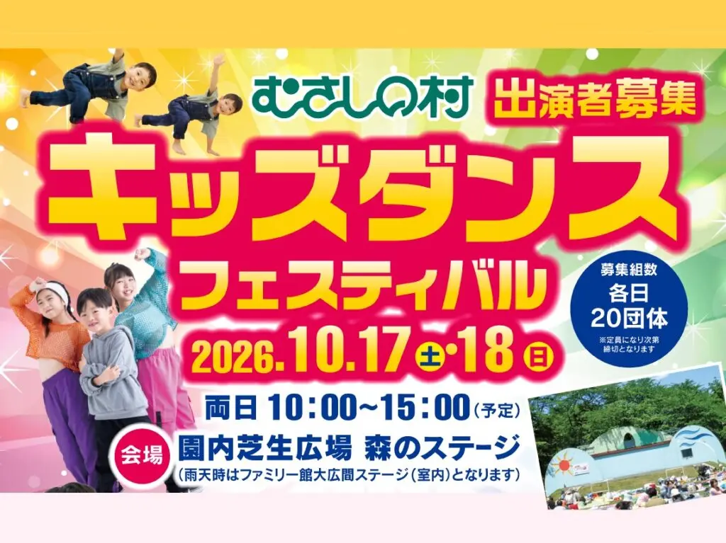 緑の中のファミリーランドむさしの村では、2026年10月17日(土)・18日(日)の2日間、「キッズダンスフェスティバル」の開催が予定されています。それに先立ち、イベントに出演する子どもたちの募集が始まりました。